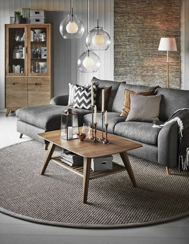 Elegant glass pendant lights dangle above the rustic wooden coffee table, which holds simple candles and a decorative lantern for added warmth.