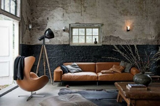 My eyes were immediately drawn to the contrast of rough and smooth textures in this living room where a warm brown leather sofa rests against a wall with peeling paint, creating an authentic lived-in atmosphere.