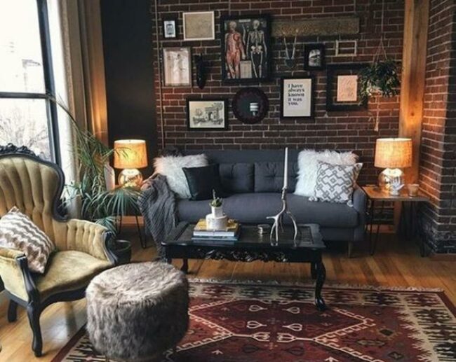 The clever mix of textures - from brick to fabric to fur - gives the room depth and character without feeling cluttered.