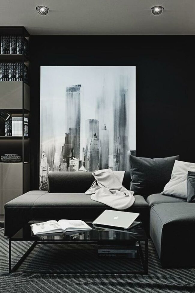 Modern drama unfolds in this living room where dark walls boldly frame a striking black-and-white cityscape print mounted above the sofa.