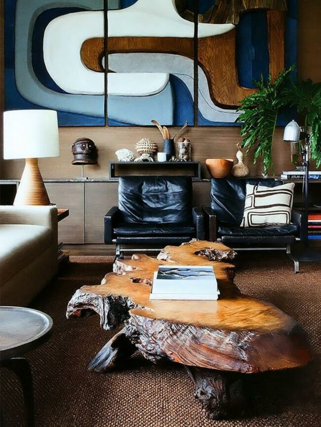 The showstopper is definitely that large wooden coffee table with its rough edges and rich grain drawing attention immediately.
