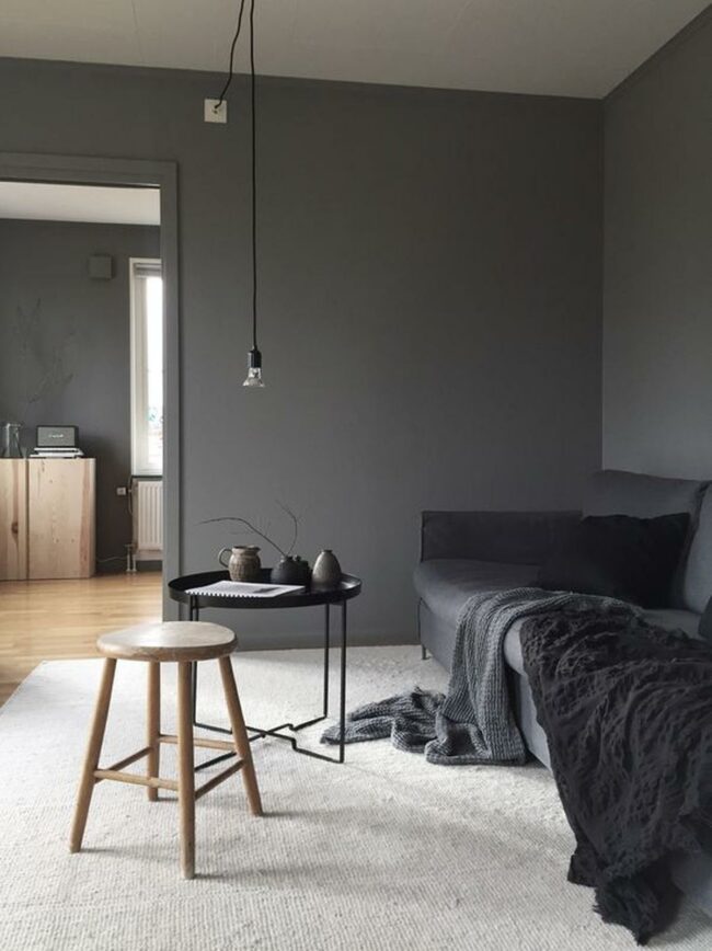 Dark gray walls create a calm atmosphere throughout the space, making everything feel connected and peaceful.