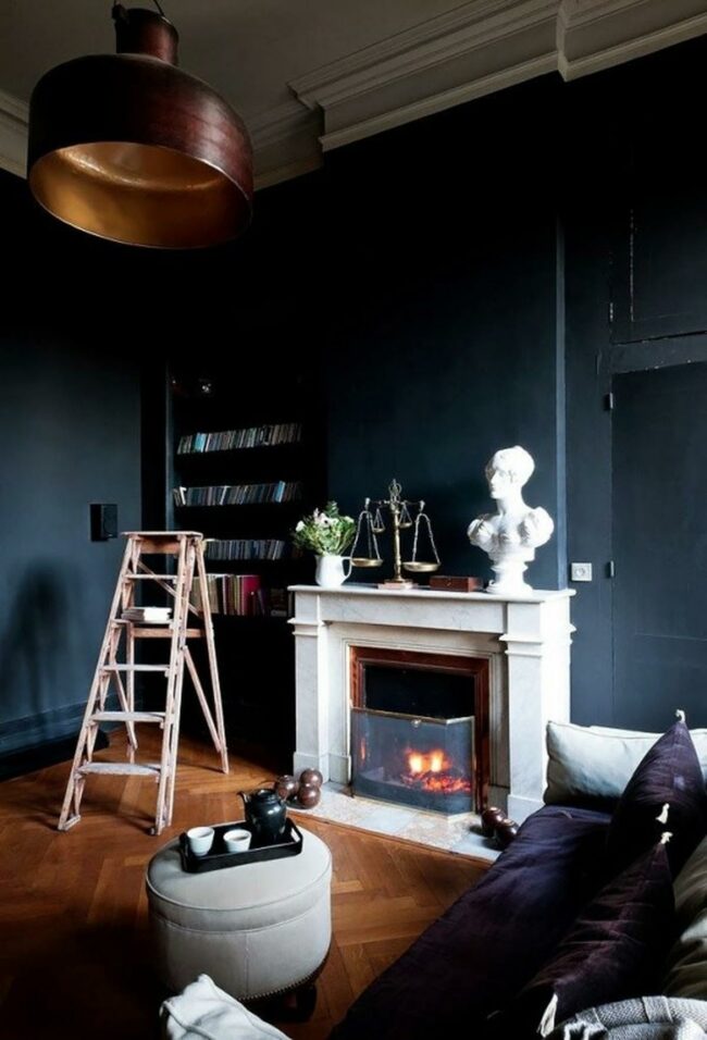 Modern style meets comfort in this welcoming living room where dark walls contrast beautifully with the wooden floor.