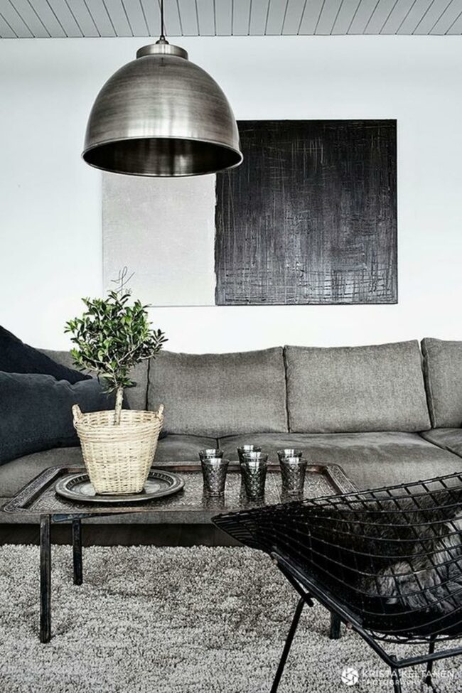Gray tones dominate this peaceful living room where a matching sofa and carpet create a harmonious base for the entire space.