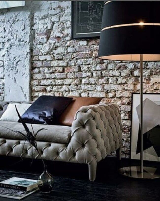 Modern style meets rustic charm in this inviting living room where a light gray tufted-arm couch rests against textured whitewashed brick.