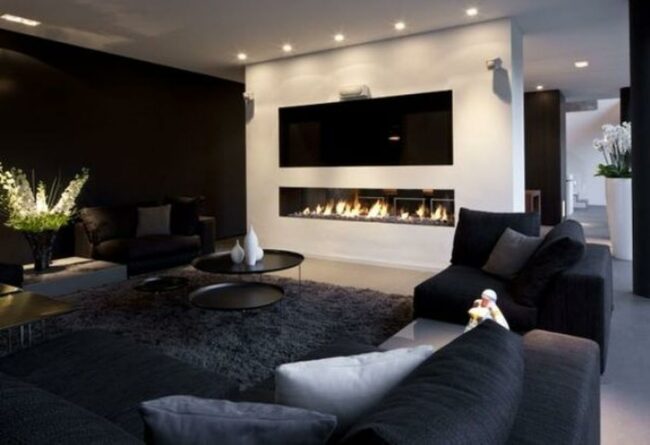 Dark walls and matching furniture create a calm, inviting atmosphere in this living room where a modern fireplace nestles into the white wall for added warmth.