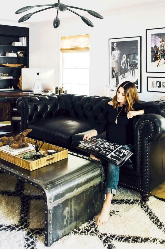 Bold black leather brings timeless elegance to the room through a button-detailed sofa that anchors the entire space.