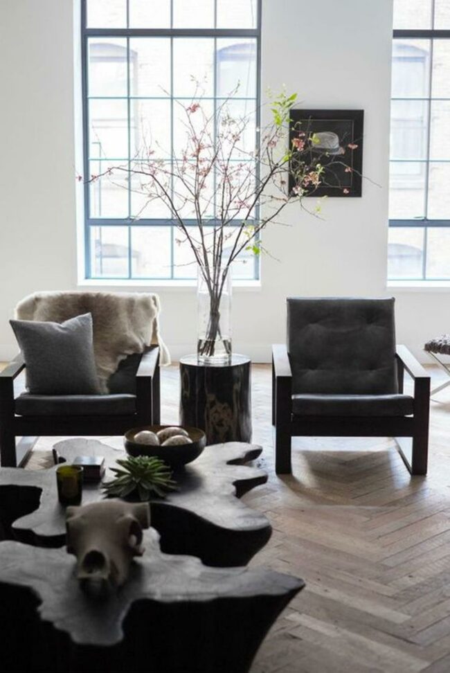 Modern simplicity defines this inviting space where two dark armchairs with clean lines face each other beside tall, light-filled windows.