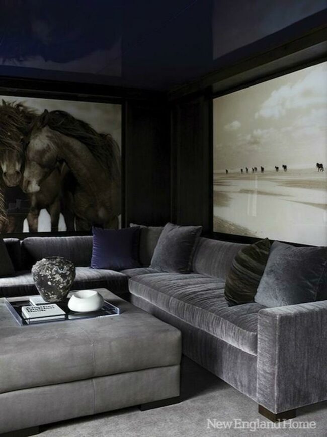 Everything works together in this stylish room – dark colors, cozy seating, and thoughtful lighting combine for maximum comfort.