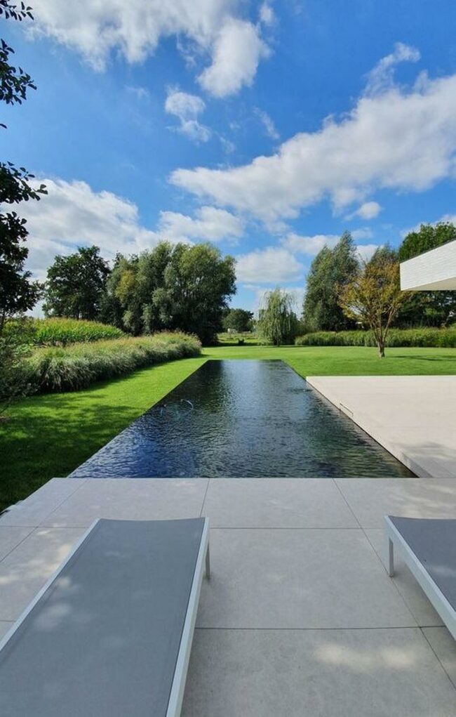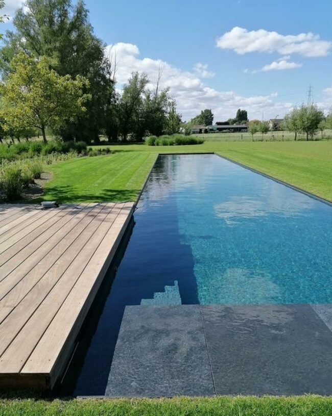 Smooth wooden decking stretches alongside the long, narrow pool, providing an inviting space for relaxation and sunbathing.