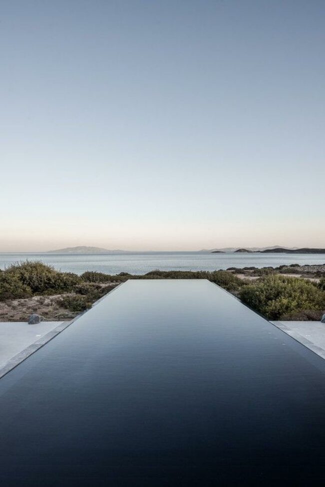Low green bushes and sandy ground frame the pool's edges, adding organic texture to the minimalist design.