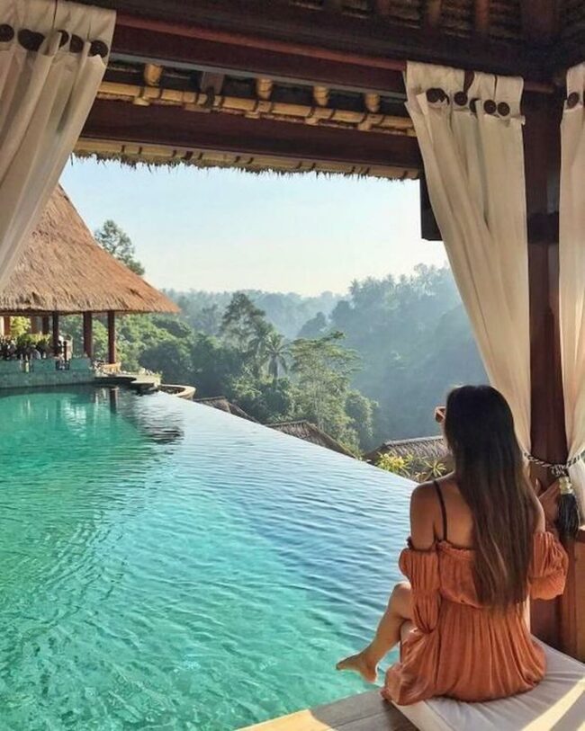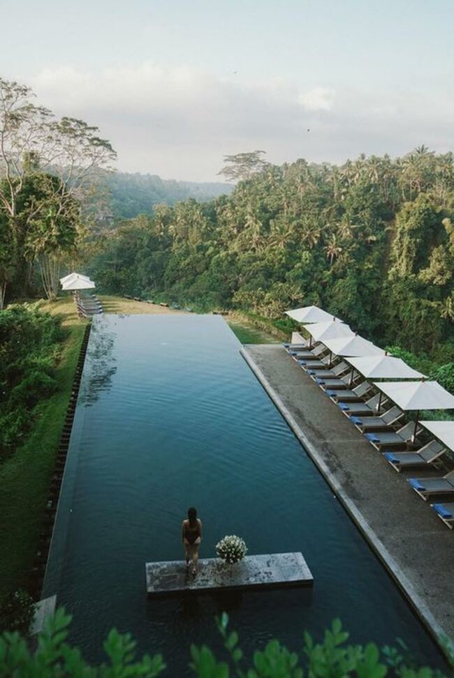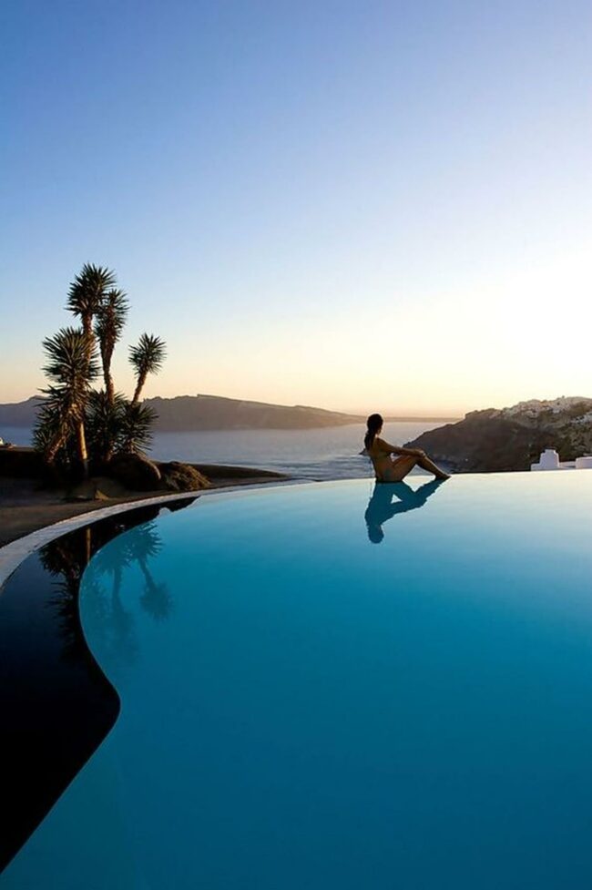 A calm woman rests near the pool's edge, her silhouette complementing the serene landscape.