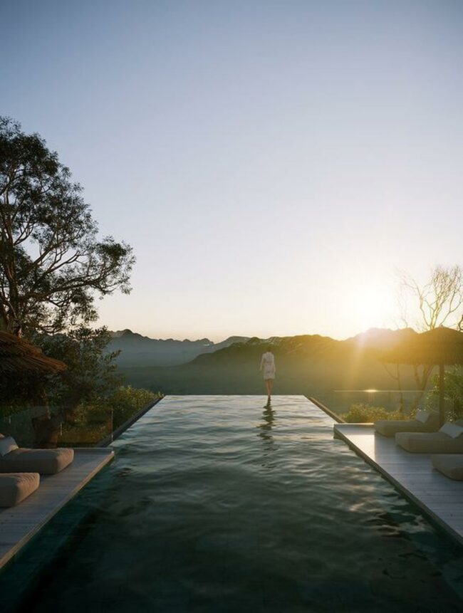 Pool edges appear to melt into the surrounding landscape, offering a calm retreat.