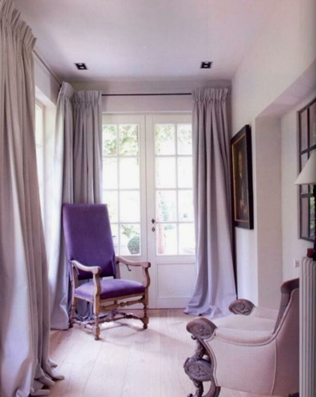 Two unique chairs - one wrapped in purple fabric with wooden arms - add character without overwhelming the space.