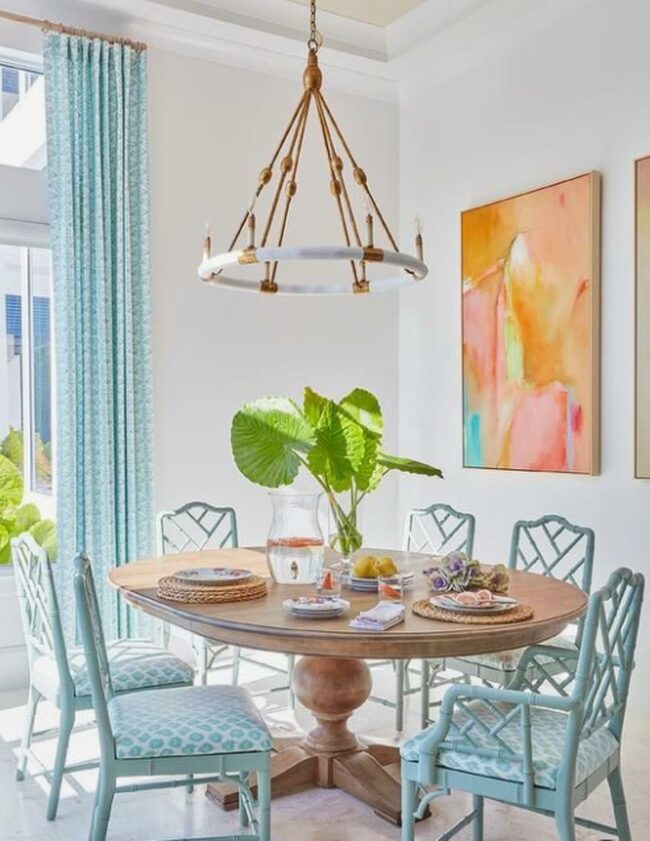 A colorful patterned rug beneath the table adds energy and ties all the elements together perfectly.