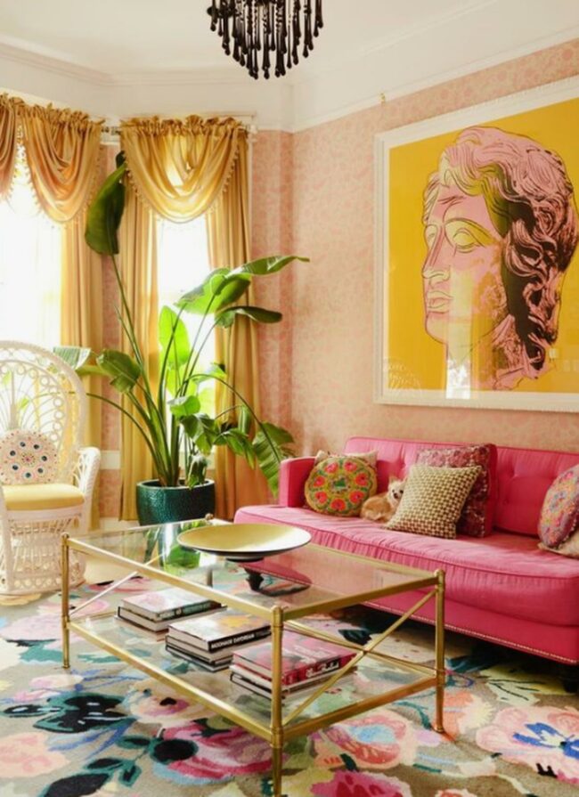 Pink sofas and colorful pillows bring life to this cheerful living room where golden-yellow curtains allow warm light to flood the space.