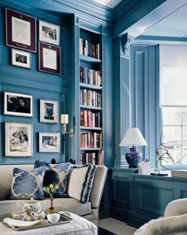 Blue walls create a calm, inviting feel in this living room where a tall built-in bookshelf packed with colorful books adds character and warmth.