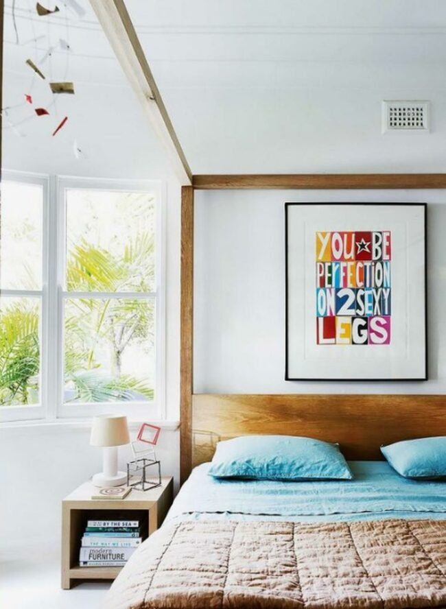 Playful text-based artwork hangs above the bed, bringing personality to the otherwise serene space.