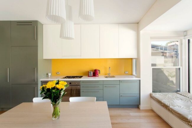 Sunshine-yellow backsplash tiles instantly grab attention in this cheerful kitchen where natural light streams through nearby windows.