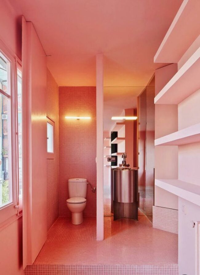 Pink surroundings create a cheerful bathroom that wraps you in warmth from every angle.