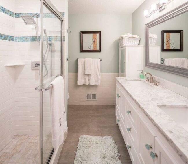 Green walls and white tiles make this bathroom feel open and clean, giving it a refreshing vibe everyone will love.