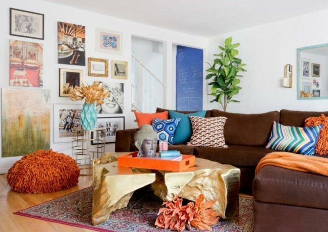 This gorgeous living room welcomes everyone with its brown couch adorned in rainbow-colored pillows that instantly catch the eye.