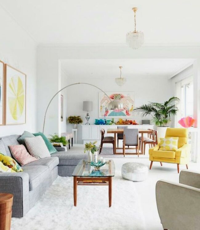 The careful arrangement of furniture creates perfect flow throughout this cheerful space where color reigns supreme.