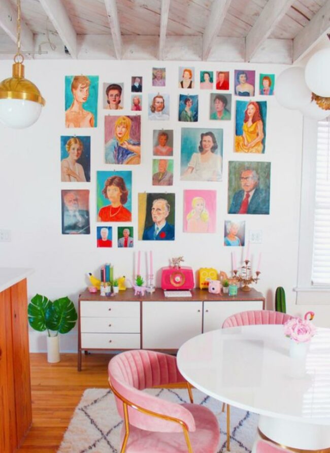 Brilliant white walls and light wooden floors create a cheerful backdrop for this inviting room where colorful portraits hang in playful arrangements.