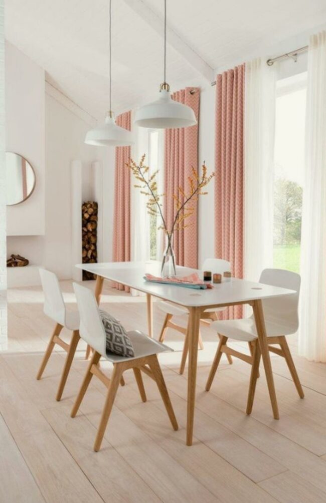 Pink curtains add just the right amount of color against the sheer white drapes, striking a beautiful balance throughout the space.