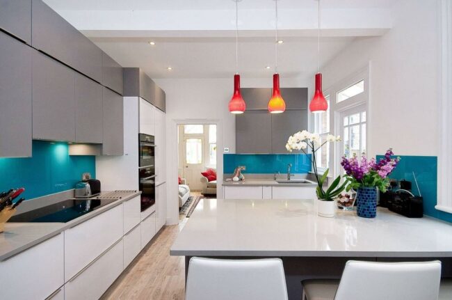 Stunning red pendant lights illuminate pristine white countertops in this welcoming kitchen, perfectly complemented by eye-catching blue walls and sophisticated gray cabinetry.