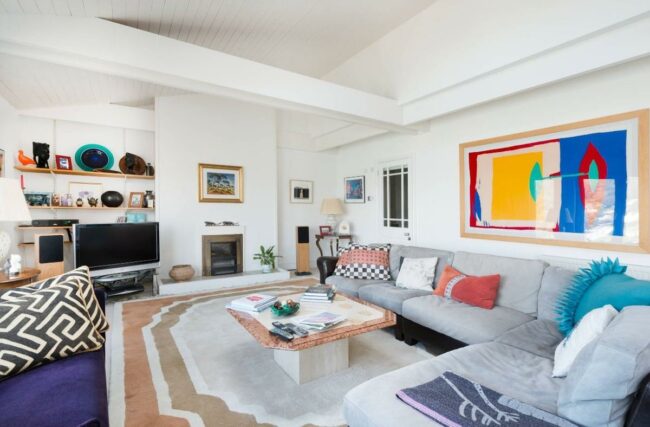 Eye-catching abstract paintings hang on the walls, their playful splashes of pink, orange, and blue adding personality to the room.