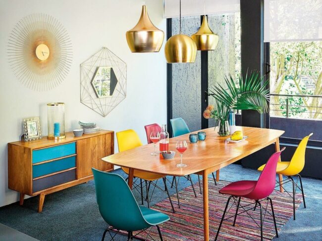 This dining room captivates with its long wooden table surrounded by colorful chairs and illuminated by three gold pendant lights that cast a warm glow throughout the space.