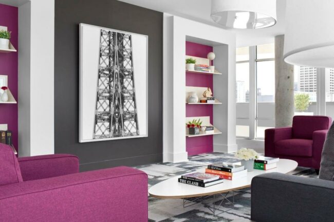The balanced color scheme of whites, grays and strategic pops of purple keeps the atmosphere calm yet interesting for daily living.