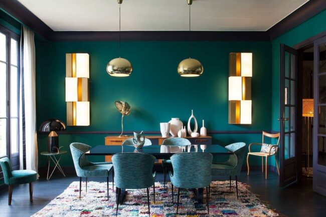 Deep green walls create a calm, rich atmosphere in this dining room where a long dark table stands surrounded by six blue-green chairs with slender black legs.