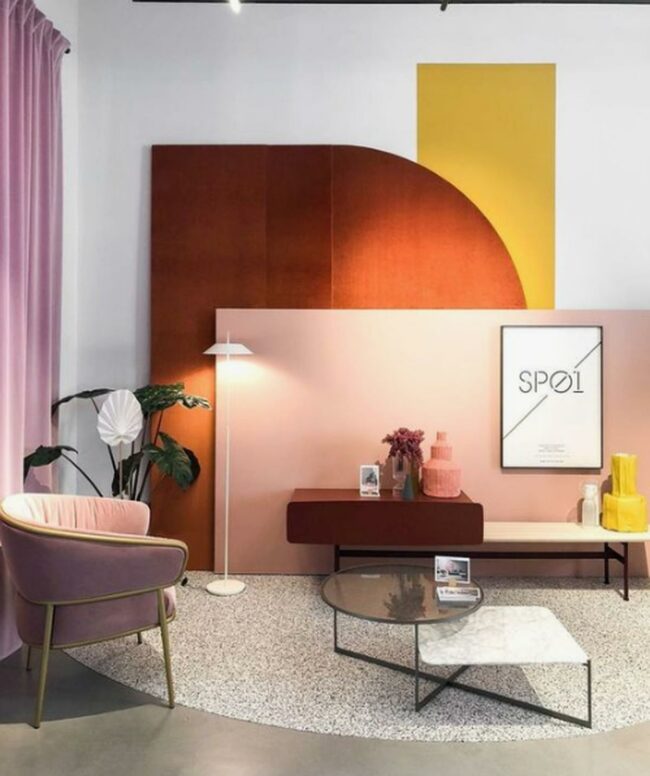 Pink, yellow, and orange create a playful geometric atmosphere in this modern living room.