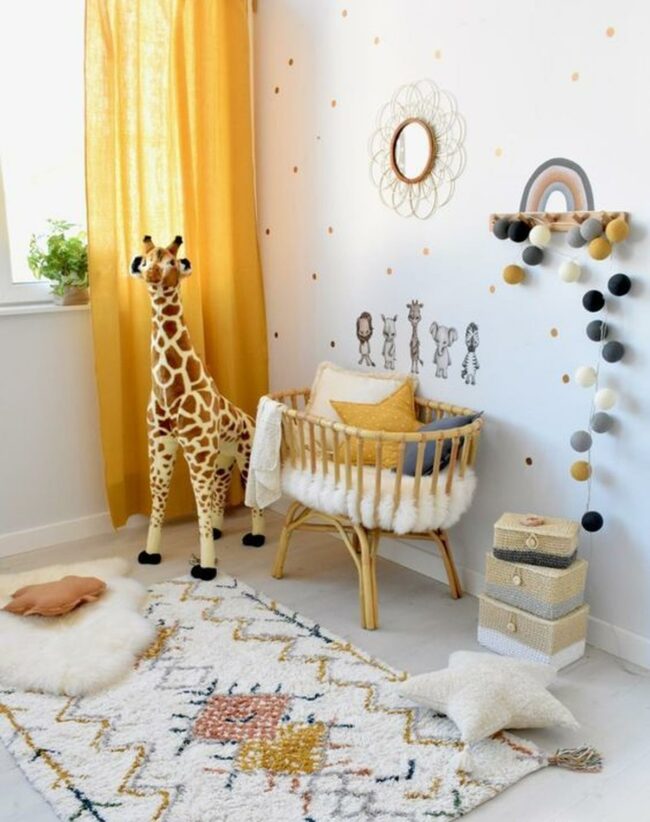The friendly giraffe toy by the window adds whimsy and character that babies find fascinating.