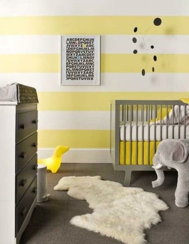 Light gray walls create a calm, fresh feeling in this nursery where a happy yellow and white striped rug warms up the wooden floor.