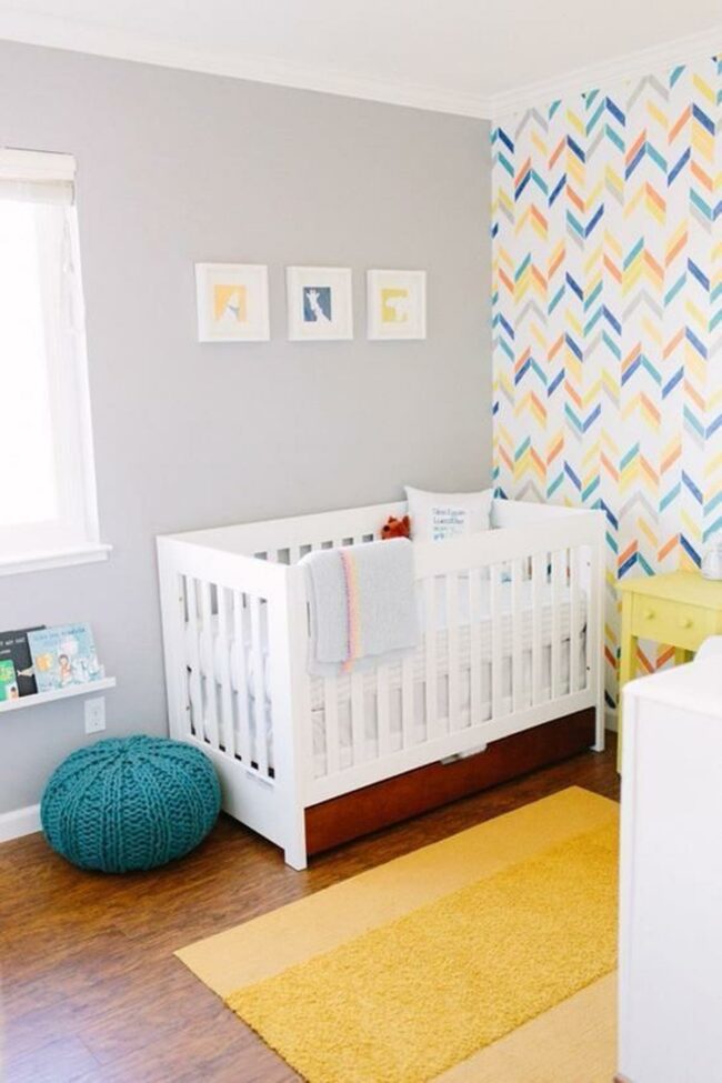 Sunshine radiates throughout this happy nursery where a bold yellow rug meets playful chevron wallpaper to create an instant mood-lifter.