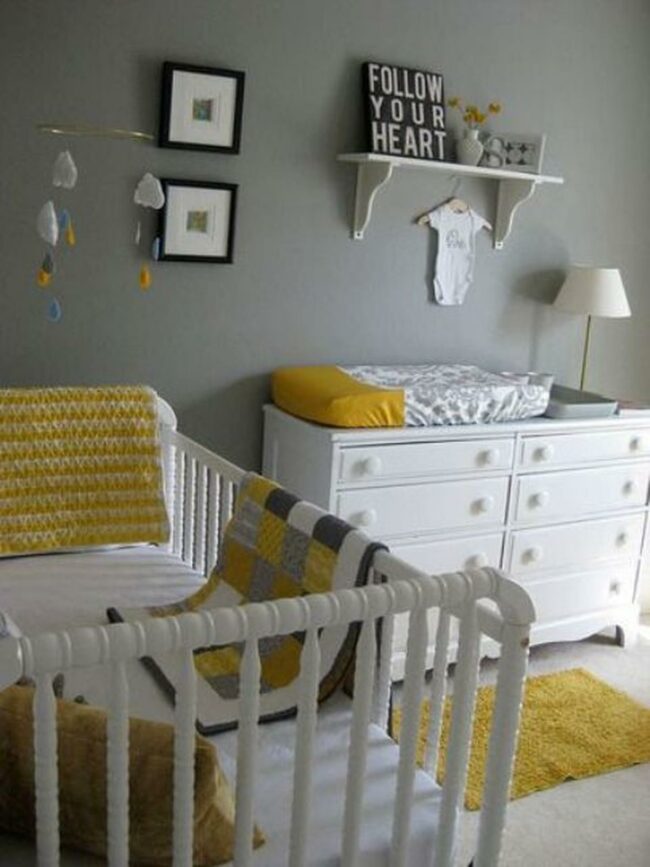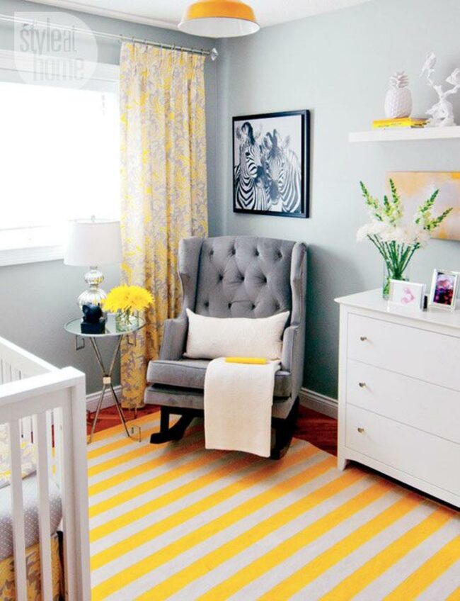 Cheerful yellow and gray tones make this nursery feel fresh and inviting for both baby and parents.