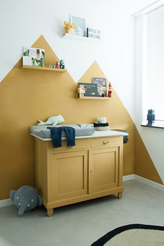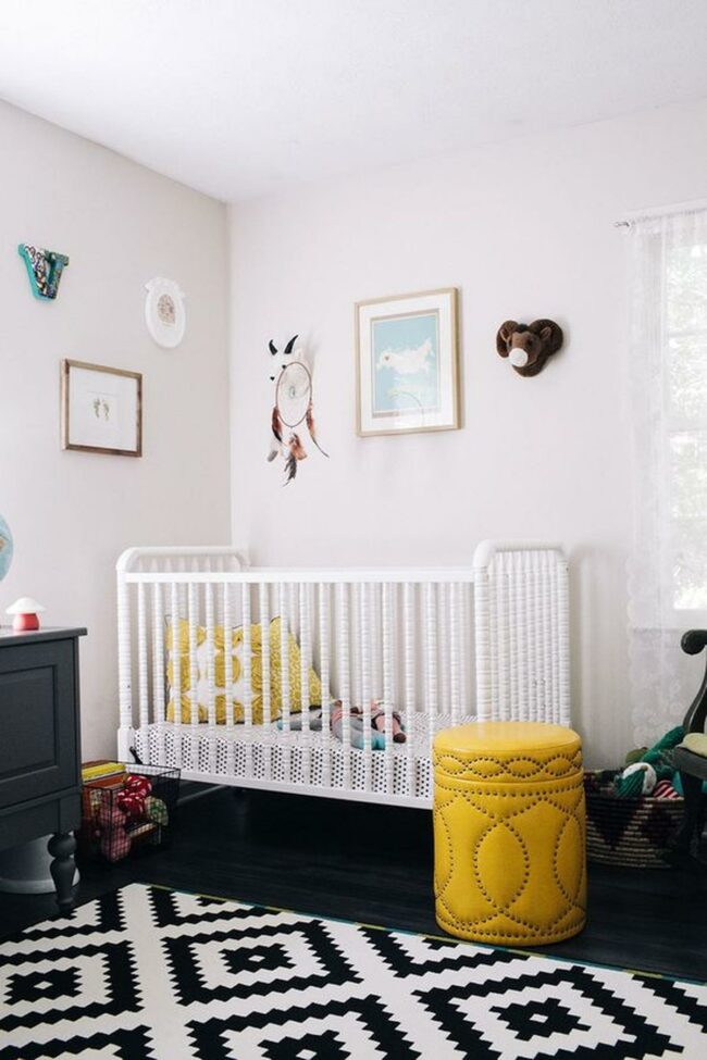 Fresh and inviting, this nursery pairs crisp white walls with a striking mustard yellow triangle that creates a focal point on one side.