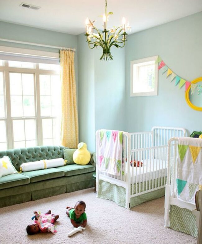 This room perfectly balances playfulness with calm, exactly what both babies and tired parents need.