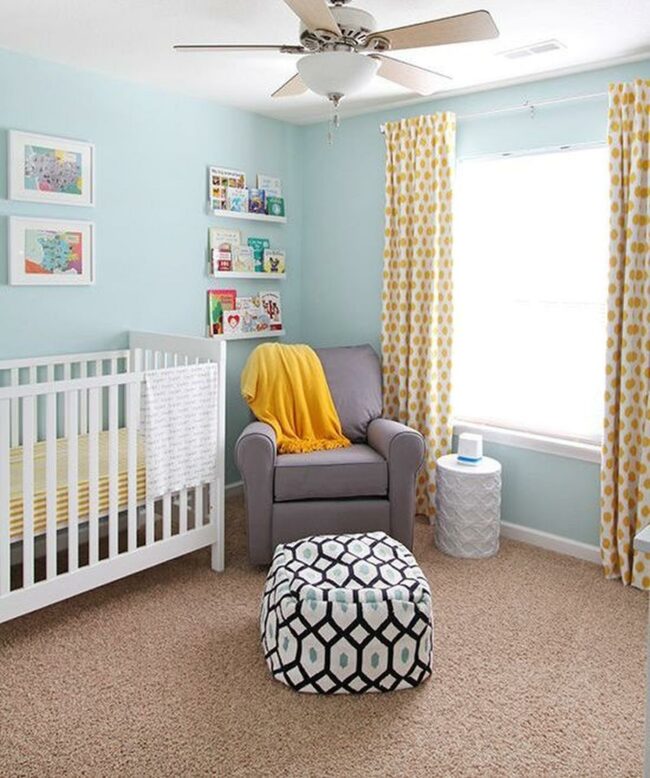 Light blue walls with yellow polka-dot curtains create a cheerful mood in this welcoming nursery.
