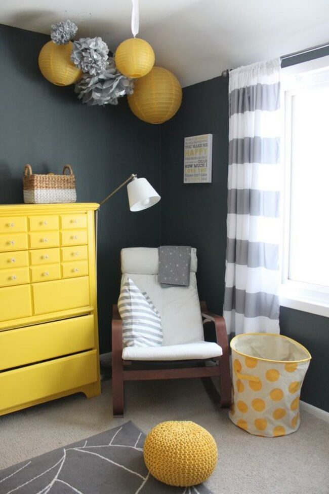A comfortable gray armchair topped with a sunny yellow pillow creates the perfect spot for late-night feedings or bedtime stories.