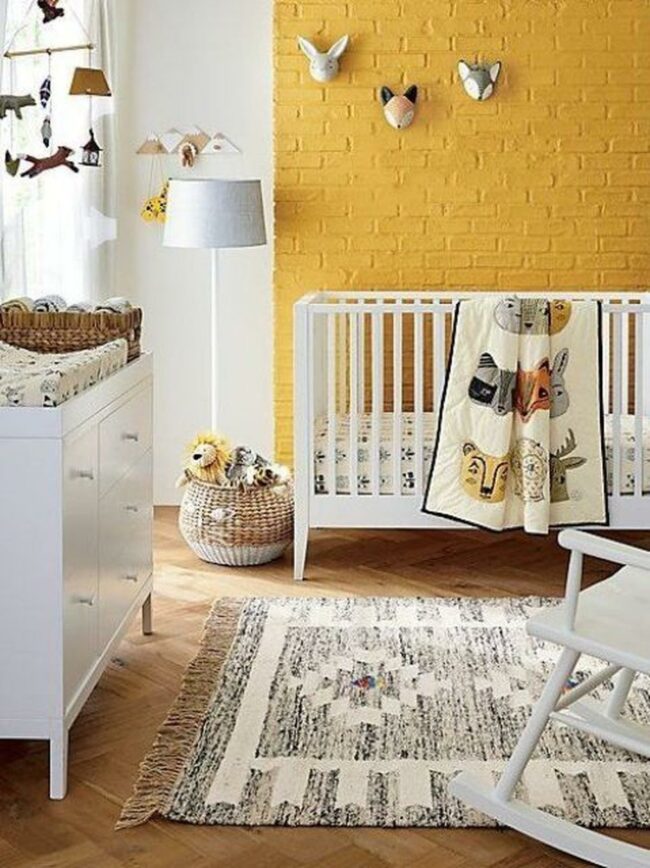 Yellow brick walls create a sunny backdrop for this cheerful nursery where a white crib adorned with an animal-print quilt takes center stage.