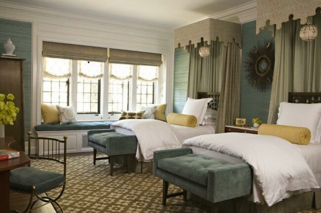 Rich green velvet benches sit at the foot of each bed, perfectly matching the textured wallpaper that wraps the room in natural charm.