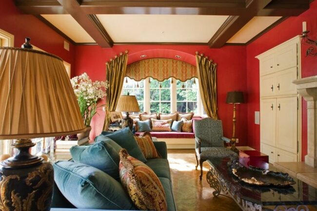 Rich red walls and wooden ceiling beams create a warm, inviting living room where family members naturally gather.