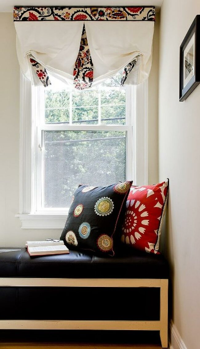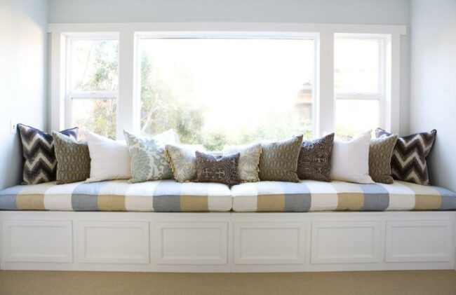 Decorative cushions with varied patterns add comfort to the built-in window seat, making it perfect for afternoon reading or morning coffee.