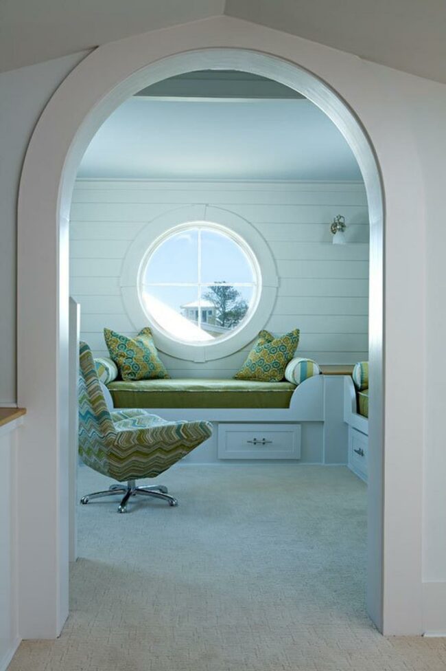 Sunlight streams through the round window of this charming nook, creating a perfect spot for relaxation or quiet reading moments.