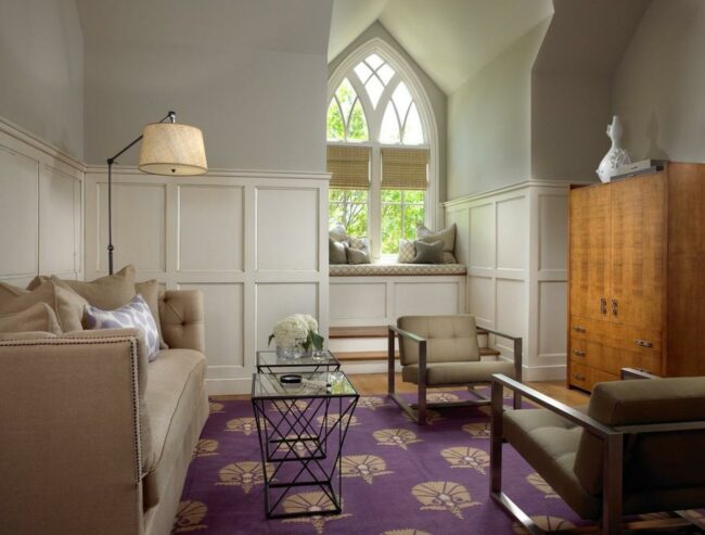 Carpeting underfoot adds necessary warmth and softness, balancing the clean lines of the window seat.