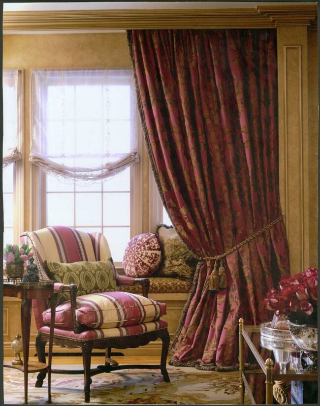 Natural light filters through sheer white curtains while heavier drapes are elegantly tied back to balance privacy and brightness.